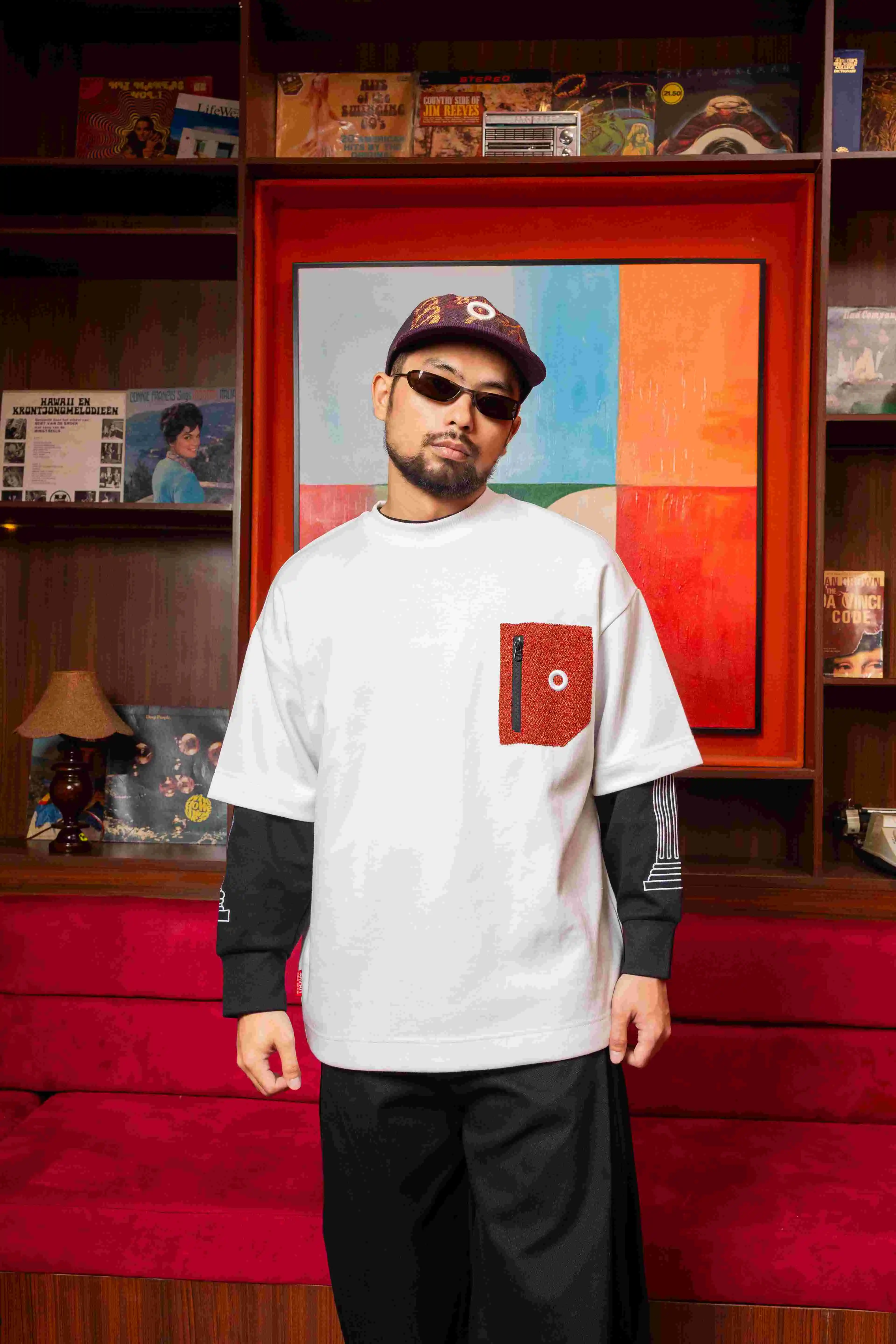 - Blanc de Fragment (Short Sleeve, White) – Rp375.000 / 15 GB / 30 hari – Minimalis dengan saku Jacquard merah ber-zipper, detail bordir “O” 3D, dan potongan oversized.